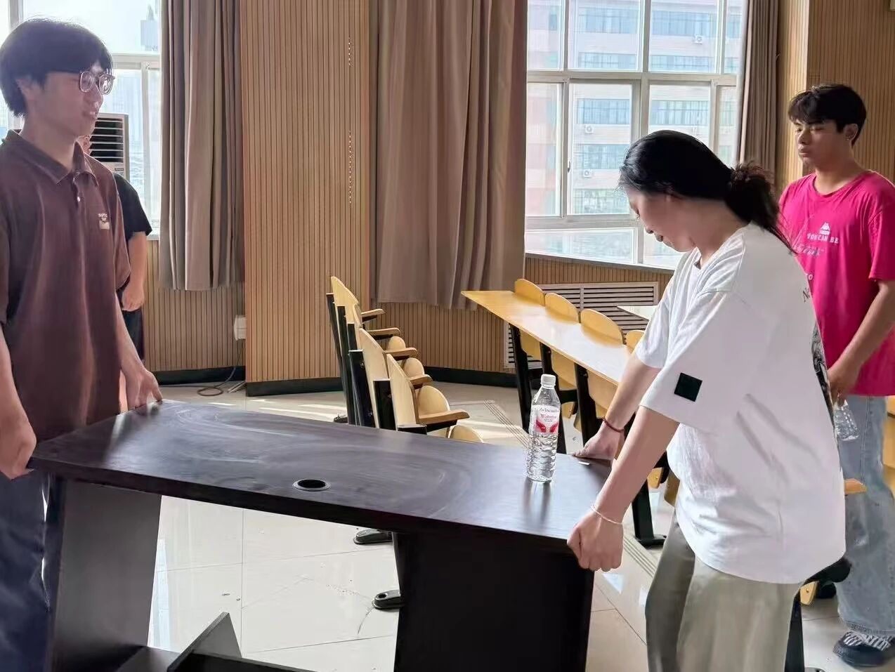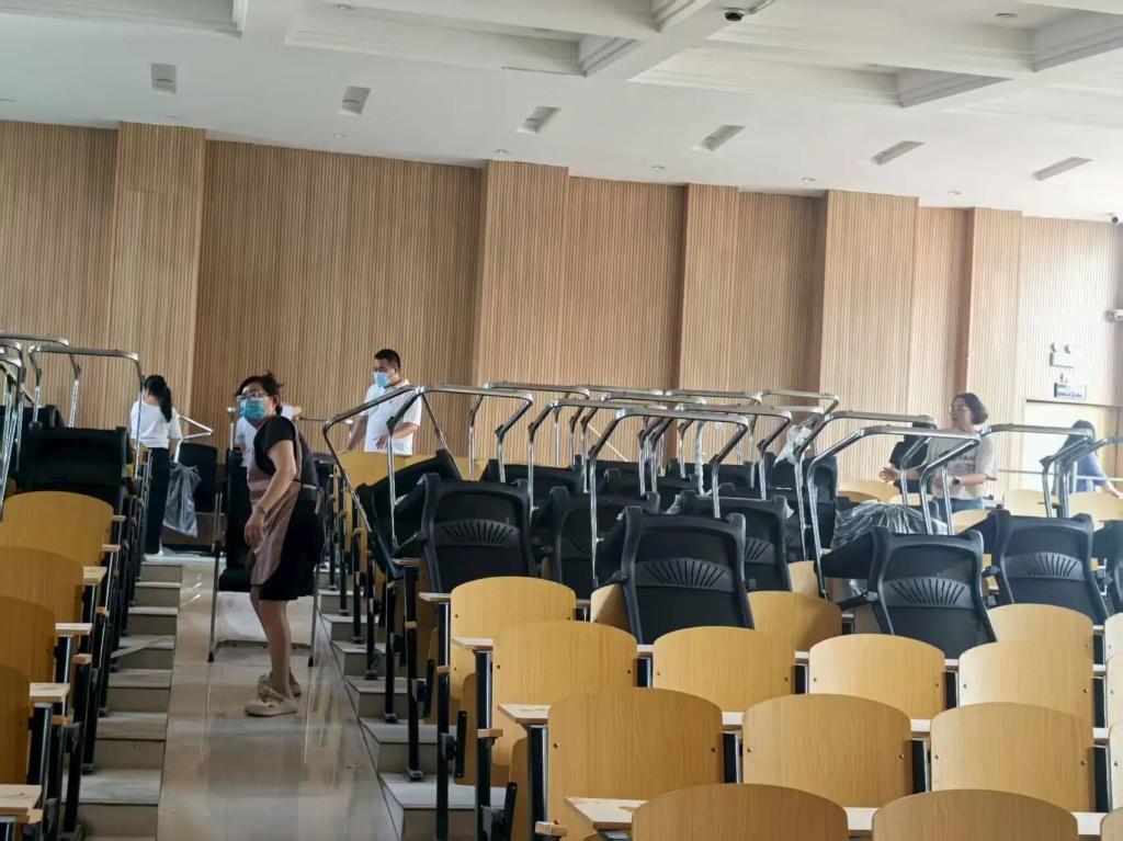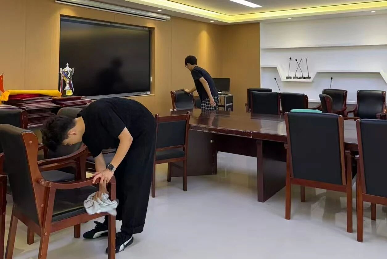 员工志愿者们也都提早返校齐聚教学楼,为新生清扫教室。他们分工协作:他们将凳子擦拭得一尘不染,用扫帚细扫地面灰尘。汗水顺着额角滑落,大家却笑着说“要让新生进门就觉敞亮”。两小时后,原本蒙尘的教室窗明几净,阳光透过玻璃洒在整洁的课桌上,满是迎接新面孔的暖意。