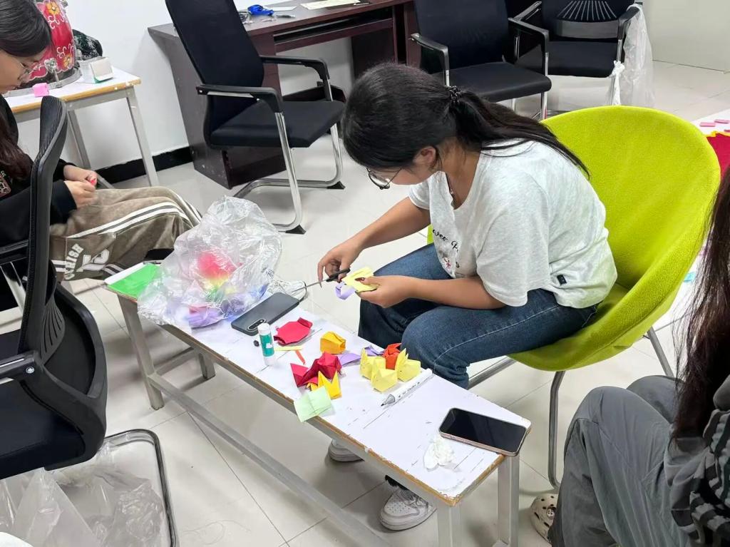 还有很多手巧的同学,以折纸的方式为大家展现不同的祝福方式,大家跟着他们学习折玉兔、灯笼与纸月亮。指尖翻飞间,一张张普通彩纸变成灵动的中秋元素,还有不少同学将作品贴在展示板上,原本空白的板子很快缀满创意,成为教学楼里一道亮眼的中秋风景。