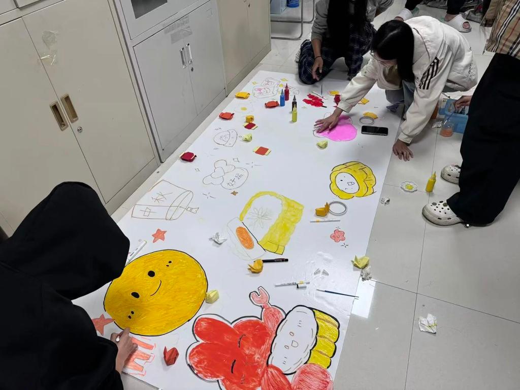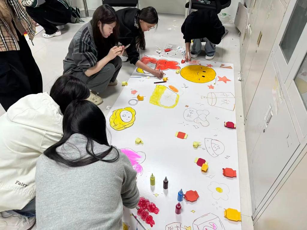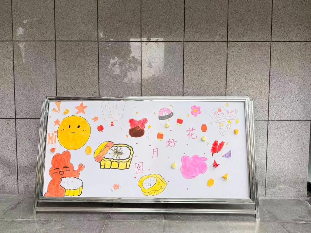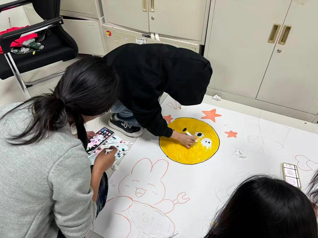 活动现场设在教学楼一楼,一张展板上整齐摆放着画笔、彩纸与颜料,同学们纷纷驻足参与。同学们默契配合,有人勾勒玉兔捣药的经典场景,有人将教学楼剪影与圆月相融,还有人用多国语言在画纸写下“中秋快乐”,色彩交织间,把对节日的理解藏进每一笔线条。