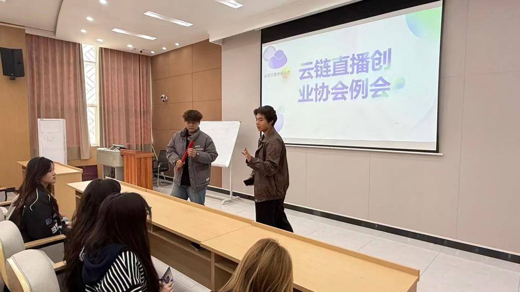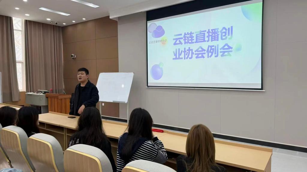 会议伊始,聂鹏老师以协会创立背景为切入点,结合直播行业的发展趋势与高校社团的育人定位,向社员们系统阐述了云链直播创研协会成立的初衷与意义。随后,聂老师分享了往届优秀学长学姐在社团期间的实践经历——他们凭借在直播策划、内容创作、运营推广等方面积累的技能,不仅在各类赛事中斩获佳绩,更在毕业后成功入职知名传媒公司、自主创业深耕直播领域,成为行业内的新生力量。针对当下“内卷”加剧的就业环境与行业竞争,聂老师鼓励社员们抓住社团提供的实践平台,主动学习直播相关技能,挖掘自身在表达、策划、镜头表现等方面的潜力,在深耕兴趣的同时,为未来的职业发展积累宝贵经验,让社团成为个人成长的“加油站”与“练兵场”。